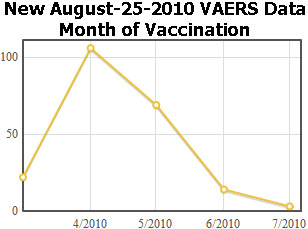 What can we learn about these reports? I wanted to find out when these vaccinations were given so I made a graph of the vaccination dates, by month. On the left is a graph of the new reports and on the right is a graph of the previous H1N1 data.