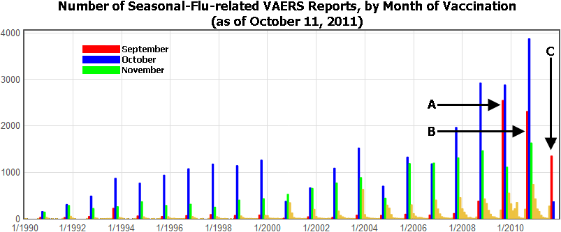 Two years ago, when the H1N1 Flu "pandemic" was in the news, my blog entry showed that September 2009 had over 1000 VAERS reports related to Seasonal Flu vaccinations. By the end of the Flu season, that number had more than doubled, and the September/October total was 5423 (see "A" below).