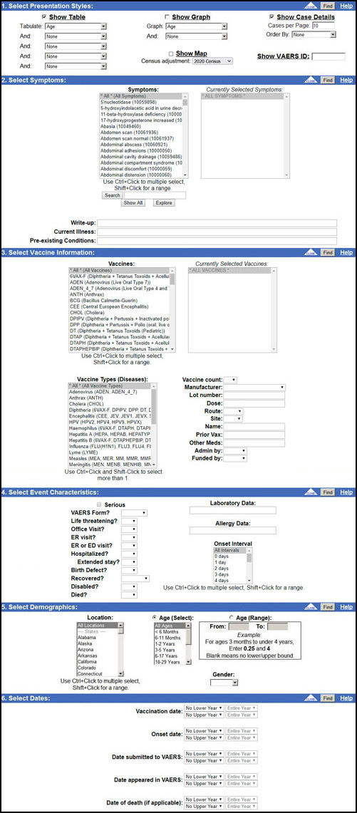Sections 2-6 of the search form let you determine which cases will be chosen for presentation and which will be ignored. By default, all of VAERS is chosen, but there are many ways to limit the search.